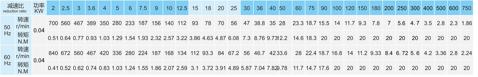 轉(zhuǎn)速是以電動(dòng)機(jī)的異步轉(zhuǎn)速(50Hz:1400r/min、60Hz:1680r/min)為基準(zhǔn)除以減速比而算 出來(lái)的數(shù)值。實(shí)際轉(zhuǎn)速將隨負(fù)載大小變化而有所變化。