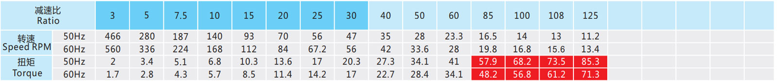 ▲ 表列轉(zhuǎn)速是基于電機(jī)異步轉(zhuǎn)速(50Hz:1400r/min、60Hz:1680r/min),額定負(fù)載時,實(shí)際轉(zhuǎn)速為表列轉(zhuǎn)速的80%-98%。