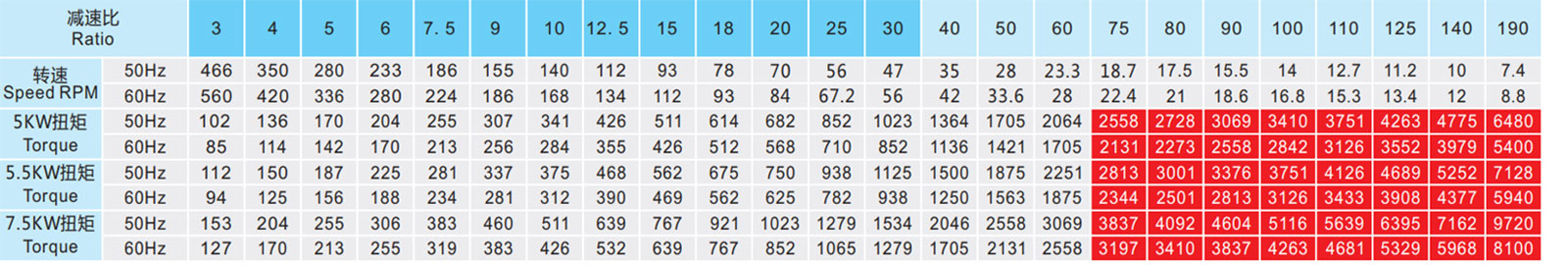 ▲ 表列轉(zhuǎn)速是基于電機(jī)異步轉(zhuǎn)速(50Hz:1400r/min、60Hz:1680r/min),額定負(fù)載時,實際轉(zhuǎn)速為表列轉(zhuǎn)速的80%-98%。