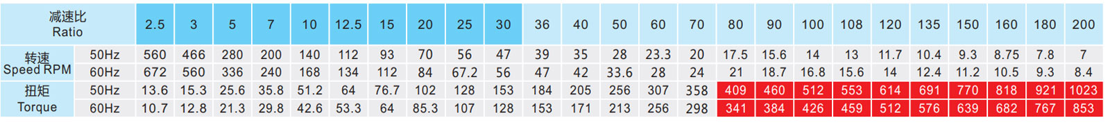 ▲ 表列轉(zhuǎn)速是基于電機(jī)異步轉(zhuǎn)速(50Hz:1400r/min、60Hz:1680r/min),額定負(fù)載時(shí),實(shí)際轉(zhuǎn)速為表列轉(zhuǎn)速的80%-98%。